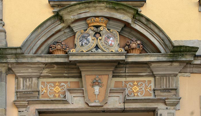 Das ältere und bessere Wappen befindet sich über dem Portal an der Nordseite des Hauses. Das heraldisch linke Wappen steht für den Ratsherrn Johann Balthasar Wibel (18.1.1693-31.1.1737), der nach dem Stadtbrand sein Haus neu im Stile der Zeit aufbauen ließ. Er war der Sohn von Josef Bernhard Wibel, Pfarrer, und dessen Ehefrau Euphrosina Driller. Er studierte Jurisprudenz und Philosophie in Tübingen, promovierte und wurde zuerst Advokat am württembergischen Hofgericht, dann ging er nach Wetzlar an das Reichskammergericht. Im Jahr 1719 wurde er in Hall zum außerordentlichen Ratsadvokat berufen, 1723 zum ordentlichen Ratsadvokaten bestallt. Im Jahr 1727 wurde er Mitglied des Rates, 1732 wurde er Amtmann im Kocheneck und 1736 Rechnungsprüfer der Stadt Hall. Er starb im Alter von nur 44 Jahren. Mit seiner am 22.8.1724 geehelichten Frau (deren Vater übrigens Johann Balthasars ehemaliger Gymnasialrektor war) hatte er insgesamt 6 Kinder, Marie Rosine (geb. 1725), Maria Elisabetha (geb. 1726, jung verstorben), Susanna Maria (geb. 1728), Friedrich Bernhard (geb. 1730), Johann Karl (geb. 1732, Pfarrer) und Catharina Magdalena (geb. 1735).