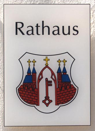 Neben der Tür befindet sich auf der Tafel das heutige, moderne Stadtwappen von Münstermaifeld: In Silber ein offenes rotes Tor, darin ein pfahlweise gestellter, mit dem Bart nach oben und links gelegter roter Schlüssel, beiderseits flankiert von einer roten, schwarz gefugten Zinnenmauer, dahinter jeweils eine zweitürmige rote Kirche mit blauen Dächern, auf dem Tor und auf den Türmen mit goldenen Kreuzen besetzt. Dieses Stadtwappen ist zugleich das älteste und das aktuelle, denn dieses Motiv ist einerseits seit 1278 in der Siegelführung belegt, auf dem ältesten erhaltenen Siegel, das nach der Verleihung der Stadtrechte 1277 in Gebrauch kam, und es wurde andererseits der Stadt 1901 durch den preußischen König Wilhelm II. bestätigt. Schon lange, bevor Münstermaifeld Stadt wurde, hatte die Ansiedlung übrigens das Marktrecht erhalten, nämlich 965.