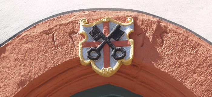 Ein drittes Wappen mit einer weiteren einst von Münstermaifeld geführten Variante, diesmal in einer beidseitig eingebuchteten, unten zweimal eingekerbten und oben an den Ecken nach hinten eingerollten Form, befindet sich auf dem auf 1575 datierten, steinernen Portalbogen im Erdgeschoß. Es zeigt in Silber ein durchgehendes rotes Kreuz, überdeckt von zwei schräggekreuzten schwarzen Schlüsseln, mit den Bärten nach oben und außen gelegt.