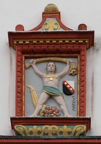 Im Giebel enthält eine kleine Aedikula eine allegorische Darstellung eines Jünglings, der breitbeinig vor einem Füllhorn steht und in den nach oben gestreckten Händen ein gebogenes Bündel von Getreidehalmen hält. Neben diesem ist über der Datierung auf 1925 ein Wappenschild angebracht, durch einen roten, mit drei achtzackigen goldenen Sternen belegten Schrägbalken von Silber und Schwarz geteilt (Hinweise willkommen).