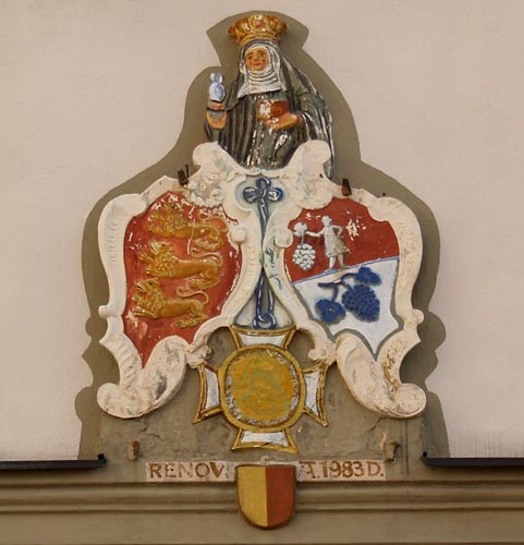 Dieses Wappen befindet sich an der Außenseite der Alexiuskapelle, die anstelle der vormaligen Agneskapelle gleichzeitig mit der Abteikirche erbaut wurde. 1999 wurde das Gebäude renoviert. Die an der Institution zu findenden Äbtissinnenwappen setzen sich aus jeweils zwei Schilden zusammen, die einander zugeneigt sind. Der heraldisch rechte ist das Abteiwappen, in Rot drei goldene, schreitende Löwen übereinander. Das ist das gleiche Wappenbild, welches auch das Eichstätter Domkapitel führt, die sog. "Leoparden der hl. Walburga", einer Schwester des Hl. Willibald, und beide sollen der Legende nach englische Königskinder gewesen sein und dieses Wappen mitgebracht haben - was aber historisch nicht zutrifft. Willibald, Wunibald und Walburga lebten im 8. Jahrhundert - da gab es definitiv weder Wappen noch Heraldik in unserem Sinne. Und damals herrschten im Königreich der Angelsachsen noch keine Plantagenets, und auch gesamt-englische Könige gab es noch nicht, sondern eine Schar von Kleinkönigen, und einen Richard gab es auch nicht, allein vom Sprachlichen her gesehen. Das wurde alles Walburga und Willibald viel später angedichtet, um ihm eine edle Abstammung nachzuweisen. Wie auch immer, die Abtei hat genau wie das Domkapitel über dieses Legenden-Konstrukt das Wappen in gutem Glauben oder zumindest in guter Absicht angenommen, auch wenn es sich bei strenger Betrachtung um ein Fabelwappen handelt. Die Hl. Walburga sehen wir übrigens als feuervergoldete Statue oben auf dem Turm der Klosterkirche.
