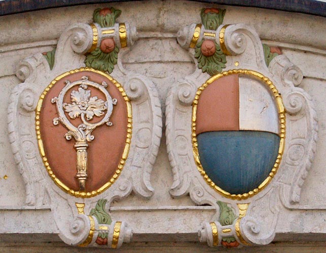 Viel weiter oben ist in einer Nische der Giebelwand das Wappen von Fürstbischof Marquard II. Schenk von Castell (reg. 1636-1685, paßt zur Erneuerung de Giebelwand im Jahre 1661) zu sehen, betitelt mit "MARQVARDVS II", geviert mit Herzschild: