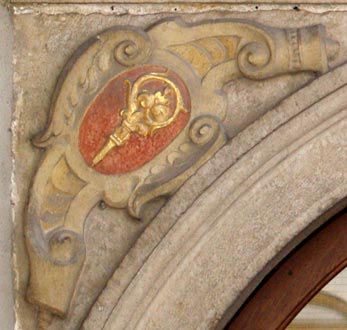 Der Dreiecksgiebel über dem Portal wird von einer Wappenplatte gesprengt, welche insgesamt drei Wappendarstellungen enthält. Oben in der Mitte befindet sich das Hochstiftswappen von Eichstätt, in Rot ein silberner, aufrechter Krummstab (Bischofsstab), auf dem Helm mit rot-silbernen Decken (hier fälschlicherweise komplett grün gestrichen) ein wachsender behandschuhter Arm, in der Faust einen silbernen (hier abweichend golden gestrichenen) Krummstab haltend.