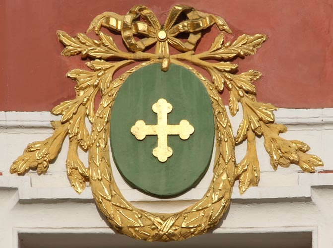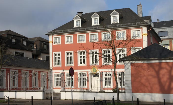Heraldisch von Interesse ist das Wappen über dem Eingangsportal in der mittleren der insgesamt sieben Fensterachsen. Inmitten eines Lorbeerkranzes befindet sich ein ovaler Schild, und oben wird das Wappen von einer gebundenen Schleife, seitlich von herabhängenden Eichenzweigen geschmückt. Der Originalinhalt der Kartusche wurde in den Revolutionswirren 1798 ff. abgeschlagen. Statt dessen wurde hier später im Jahre 1857 ein neuer Inhalt angebracht, es handelt sich um das Wappen des Trierer Bischofs Wilhelm Arnoldi (1842-1864), ein Kleeblattkreuz, hier golden auf grünem Grund (vgl. Siebmacher Bistümer, aber dort mit anderen Tinkturen). Ein weiteres Wappen dieses Bischofs kann an der Kilianskapelle hinter dem Dom gefunden werden.