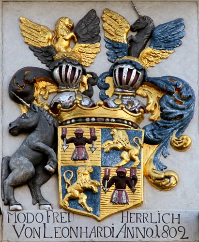 Heraldisch rechts befindet sich der Wappenschild der Freiherren von Leonhardi wie oben beschrieben. Es steht hier für Johann Peter Freiherr von Leonhardi (4.12.1747-22.11.1830). Er war ein wohlhabender Kaufmann und Bankier in Frankfurt am Main. Dazu ist er als Politiker bekannt geworden, war kaiserlicher Rat, ab 1780 Mitglied und 1800-1810 Senior des Bürgerausschusses der Einundfünfziger in Frankfurt am Main (ein 1732 eingesetztes Gremium, das die Finanzverwaltung der Stadt Frankfurt beaufsichtigte, bestehend aus 51 gewählten Vertretern der Bürgerschaft) und während des Großherzogtums Frankfurt seit 1812 Präsident des Departementalrates. Dazu hat er sich einen Namen als bekannter Freimaurer gemacht, unter dessen Führung sich die Provinzialloge von Frankfurt 1823 für unabhängig erklärte und sich als selbständige Großloge des eklektischen Freimaurerbundes etablierte, womit die englische Oberhoheit über die deutschen Freimaurer beendet wurde. Johann Peter von Leonhardi wurde am 27.8.1791 von Carl Theodor von der Pfalz für seine Verdienste in Wirtschaft und Politik in den Freiherrenstand und am 15.3.1794 von Kaiser Franz II. in den Reichsfreiherrenstand erhoben.
