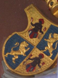 Im Rietstap wird der Schild wie folgt beschrieben: "Écartelé: aux 1 et 4 d'or à un homme issant, habillé de sable, au rabat d'argent, tortillé de gueules, posé de front, tenant de chaque main une flèche de gueules, empennée d'azur, en pal, la pointe en bas, accompagnée d'un tertre de trois coupeaux de sable en pointe, aux 2 et 3 d'azur à une piramide (pyramide) triangulaire d'argent, sommée d'un soleil d'or, posée sur un échiqueté d'azur et d'argent, les points rangés selon la perspective d'un pavé, la dite piramide (pyramide) percée d'une porte de sable sur le flanc dextre." Also auch hier die zuvor erwähnten Details, die am Gebäude nicht zu erkennen sind.