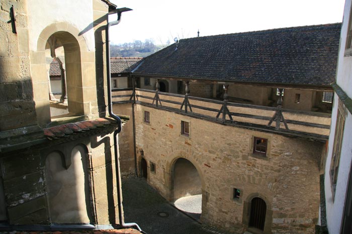 Abb.: Blick nach Durchschreiten des Torhauses auf die Michaelskapelle mit der romanischen Zwerchgalerie. Im Erdgeschoß führt der Torweg wie durch einen Tunnel unter dem Gebäude hindurch und erreicht das mittlere Niveau der Anlage. Rechts im Bild ist die Alte Dekanei angeschnitten.