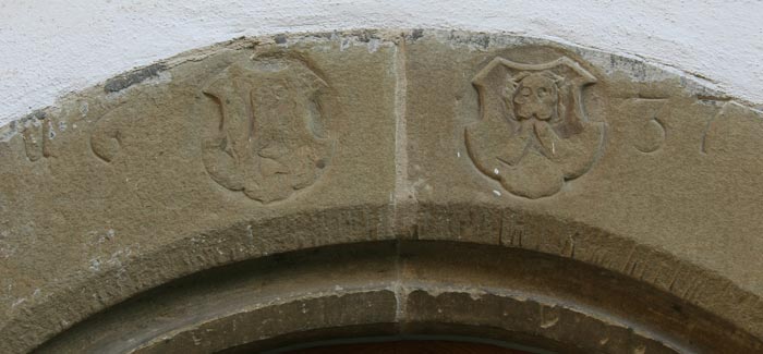 Johann Adam Truchseß von Höfingen (Höffingen) war 1621-1639 der fünfzehnte Dekan auf der Comburg, dazu war er noch Domdekan zu Eichstätt und Domherr zu Augsburg. Von ihm finden wir ein Wappen an einem steinernen Gewände eines rundbogigen Eingangs, datiert auf 1637. Zwei separate Schilde teilen die Jahresangabe.