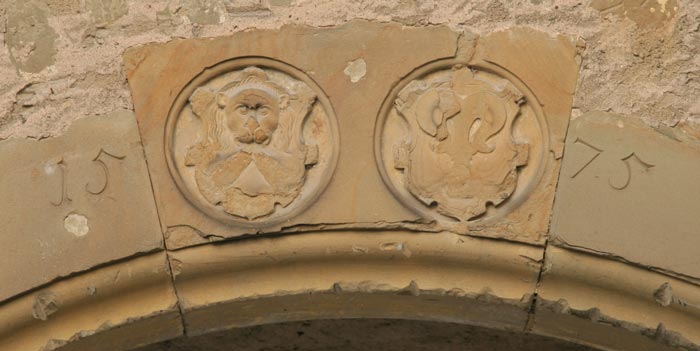 Der innere Torbogen des Torbaus besitzt einen Schlußstein, der die Jahreszahl 1575 in zwei Ziffernpaare trennt und zwei Schilde mit geschweiften und beidseitig eingebuchteten Rändern, jeweils innerhalb eines kreisrunden, profilierten Medaillons. Das inhaltliche Programm ist das gleiche wie zuvor, heraldisch rechts das Stiftswappen der Comburg, heraldisch links der Schachroch der Neustetter gen. Stürmer.