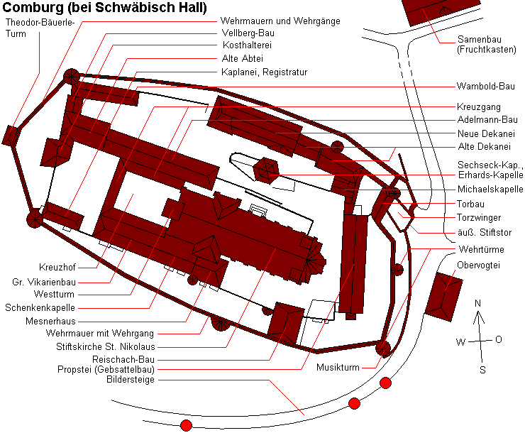Der Mittelrisalit hat in seinem dreieckigen Giebelfeld eine Darstellung mit dem Stiftswappen der Comburg, in Blau ein goldener, hersehender Löwenkopf (Löwenmaske, Leopardenkopf), der in die Spitze eines erniedrigten goldenen Sparrens beißt. Das Stiftswappen wird umgeben von drei barock interpretierten Rittern, den Stiftern des Klosters. Diese Figuren beziehen sich auf die Grafen von Comburg, die 1078 ihre Burg im Zuge der von den Lothringer Reformklöstern ausgehenden Frömmigkeitsbewegung des 12. Jh. in ein Kloster verwandelten, welches in seiner Ausrichtung noch weiter ging und sich noch während des Baus der noch radikaleren Hirsauer Reformbewegung anschloß und Beziehungen zu den Reformklöstern Lorch und Maria Laach unterhielt. Der letzten Generation der Grafen von Comburg-Rothenburg gehörten vier Brüder an, die Grafen Burkhard, Rugger (Rutger), Emehard und Heinrich. Burkhard war der eigentliche Betreiber der Klostergründung. Aufgrund einer fortschreitenden körperlichen Einschränkung (evtl. massive Osteoporose), die ihn immer stärker verkrüppelte, konnte er immer weniger das normale Leben eines Adeligen seiner Zeit führen und wandte sich ersatzweise vermehrt der Religion zu. Er stand in Kontakt mit Abt Wolfhelm vom Kloster Brauweiler, und alles zusammen ergab die Rahmenbedingungen, innerhalb derer er sich für ein kontemplatives Leben entschloß. Die ersten Mönche kamen aus Brauweiler, aber bald schon suchte man den Anschluß an Hirsau, und der erste Abt kam von dort. Stilistisch und architektonisch war die mittelrheinische Baukunst der Romanik richtungsweisend mit den Wandgliederungen aus Lisenen und Rundbogenfriesen, mit den Würfelkapitellen und Zwerggalerien. Die Spitzkonsolen unter den Rundbogenfriesen sind hingegen eine Comburger Eigenart, die sich auch in Steinbach und in Kleincomburg finden lassen.