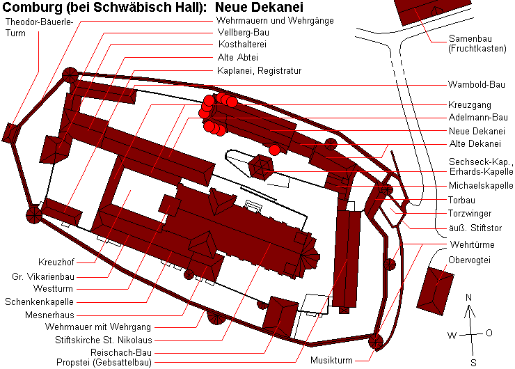 Trotz dieser beengten Raumsituation entschloß man sich unter Dekan Wilhelm Ulrich von Guttenberg, anstelle der alten Gebäude aus dem Mittelalter und der Renaissance einen gewaltigen, zur Rampe hin zweistöckigen Repräsentativbau mit Mansarddach zu errichten, mit einem Mittelrisalit und zwei Eckrisaliten von jeweils drei Fensterachsen und je fünf Fensterachsen dazwischen. Insgesamt 19 Fensterachsen sah die ursprüngliche Planung vor, der die alte Dekanei bei vollständiger Ausführung zum Opfer gefallen wäre, der romanische Torbau ebenso. Vielleicht hätte man sogar die Sechseckkapelle abgerissen. Doch die neue Dekanei wurde mangels Geld nie fertig, sondern blieb Torso, und glücklicherweise blieben die einzigartigen älteren Baudenkmäler erhalten. Realisiert wurde nur der linke Teil inclusive dem Mittelrisalit, von insgesamt 11 Fensterachsen Breite. An den beiden östlichen Gebäudeecken zeugt die zackig aufgelassene Mauer sowohl auf der Vorder- als auch auf der Rückseite von der geplanten Fortsetzung. Johann Gottfried Lothar Franz von Greiffenclau zu Vollraths, der letzte Comburger Dekan, baute zwar weiter an der Dekanei, aber auch er konnte sie aus finanziellen Gründen nicht fertigstellen, denn die Kriege von 1796, 1799 und 1800 brachten solche Belastungen mit Einquartierungen, Kontributionszahlungen und Naturalabgaben, daß finanziell keinerlei Spielraum mehr fürs Bauen blieb. Als die Comburg Apanage-Schloß für einen württembergischen Prinzen war, wurde in der Neuen Dekanei am 21.2.1808 Prinz Friedrich Carl Augustus geboren, der Vater des späteren Königs Wilhelm II. von Württemberg (25.2.1848-2.10.1921). Heute sind im Inneren der Neuen Dekanei oben der Rokoko-Festsaal sowie Büros für die Akademieverwaltung und unten die Küche, der Speisesaal und zwei weitere Büroräume untergebracht.