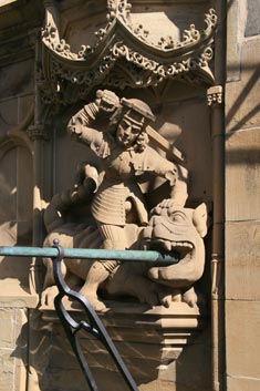 Die drei Wasserauslässe entspringen jeweils einer gotischen Skulptur. Ganz rechts sehen wir Simson, der den Löwen mit bloßen Händen bändigt, ganz links ist St. Georg mit dem Lindwurm, der gerade mit dem Schwert getötet wird, und in der Mitte ist St. Michael, der den schon auf dem Rücken unter ihm liegenden Drachen mit einer oben in ein Kleeblattkreuz auslaufenden Lanze tötet.