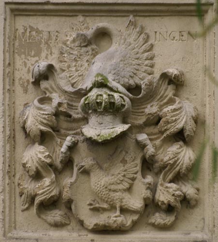 Die Herren von Mentzingen führen in Silber einen schwarzen auffliegenden Raben, und als Kleinod zu schwarz-silbernen Decken einen wachsenden silbernen Schwan mit goldenem Schnabel, häufig gekrönt (hier nicht), die Flügel oft auch mit goldenen Saxen, die Schwungfedern des Schwanes schwarz und mit silbernen Sternen, Kreuzchen oder wie hier mit Lindenblättern belegt. Das Wappen wird beschrieben im Siebmacher Band: Bad Seite: 11 Tafel: 8, sowie im Wappenbuch des Stephan Brechtel (BSB Cod. icon. 390). Hier steht das Wappen für die Brüder Friedrich und Burkhart von Mentzingen als Erben Weyrichs von Gemmingen.