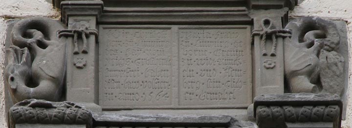 Die Inschrift der linken Tafel lautet: "Wir christoff Herr zu Limpurg des Hay(ligen) Röm(ischen) Reichs Erbschenk semperfrei haben di(e)sen Baw vol(l)fuert in anno 1564." Die Inschrift der rechten Tafel lautet: "Maria Fraw zu Limpurg gebor(e)ne Gr(a)effin zu Wi(e)dt, Runckeln vnd Isemberg sein e(he)liche Gemahel.&ldquo Bei dem Bauherrenpaar handelt es sich also um Christoph zu Limpurg-Gaildorf, des Heiligen Römischen Reiches Erbschenk und Semperfrei (12.7.1531-3.9.1574) und seine erste Frau Maria von Wied-Runkel und Nieder-Isenburg (-15.3.1563).