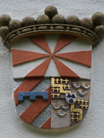 Die genealogische Basis für diese Wappenkombination sind die beiden Ehen des Bauherrn Johann Lothar Freiherr Waldbott von Bassenheim (-21.2.1667), Herr zu Bassenheim und Pyrmont, kurmainzischer und kurkölnischer Geheimrat, Amtmann zu Lahnstein und Andernach. Seine erste Frau war Johanna Walpurga von Reiffenberg (-3.2.1651), Tochter von Johann Heinrich Freiherr v. Reiffenberg (-4.3.1628) und dessen Frau Anna v. Cronberg (-24.1.1651). Und seine zweite Frau war Anna Magdalene Gräfin v. Metternich-Winneburg und Beilstein, Tochter von Wilhelm Freiherr v. Metternich-Winneburg und Beilstein (-1652), kaiserlicher Hof- und Kriegsrat, kurtrierischer Amtmann von Mayen, Monreal und Kaisersesch, Burggraf zu Starkenburg, kurmainzischer Geheimer Rat, spanischer Oberst, Oberstmarschall, Oberhofmeister der Kaiserin Eleonore, kaiserlicher Kammerherr und Burggraf zu Eger, der am 28.10.1635 den Reichsfreiherrenstand erhielt, und dessen Ehefrau Anna Eleonora Brömser v. Rüdesheim. Anna Magdalene war die Schwester von Karl Heinrich v. Metternich (15.7.1622-26.9.1679), der am 9.7.1679 Kurfürst und Erzbischof von Mainz und Fürstbischof von Worms wurde.