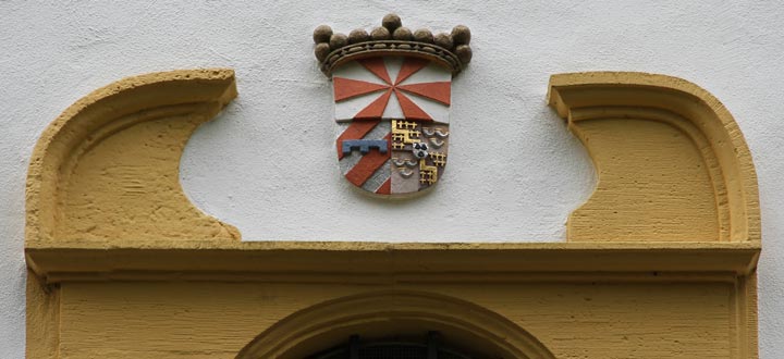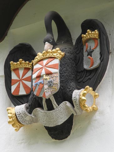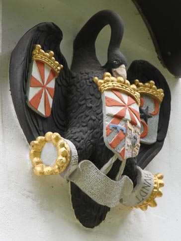 Diese aufwendige heraldische Komposition über dem Eingang enthält die gesamte Genealogie des Bauherrn, seiner Eltern und Ehefrauen. Auf der Brust des Schwanes befindet sich das Wappen des Bauherrn, bereichert um die Komponenten seiner beiden Ehefrauen. Das Wappen ist geteilt und halbgespalten, oben: zwölffach rot-silbern geständert (Waldbott von Bassenheim), unten rechts: fünfmal rot-silbern schräggeteilt, darüber ein dreilätziger blauer Turnierkragen (von Reiffenberg), unten links: geviert mit Herzschild: Feld 1 und 4: in Rot ein schrägrechter, staffelförmiger, silberner Balken, oben und unten begleitet von je drei goldenen Kreuzchen (Winneberg), Feld 2 und 3: in Rot drei (2:1) silberne Hifthörner mit goldenen Spangen und Bändern (Braunshorn-Beilstein), Herzschild: in Silber drei (2:1) schwarze Jakobsmuscheln (Metternich).