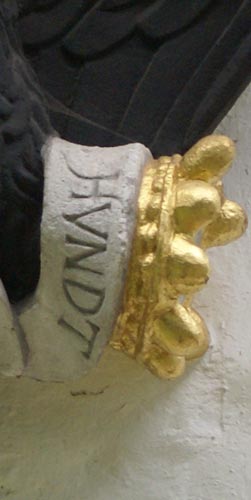 Die Füße des Schwanes enden außergewöhnlich: Beide sind mit einer vergoldeten, nach außen gerichteten Krone besteckt, und der Übergang wird von einem über den Fuß geworfenen Schriftband verdeckt. Optisch links ist der Name "REIFFENBERG" zu lesen für die erste Frau des Bauherrn, optisch rechts "HVNDT" für seine Mutter.