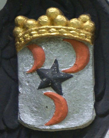 Abb. links: Wappen am rechten Fenster der Ostseite. Über allen Schilden ruht eine Perlenkrone, die bei den Fenstern der Ostseite nicht vergoldet sind.