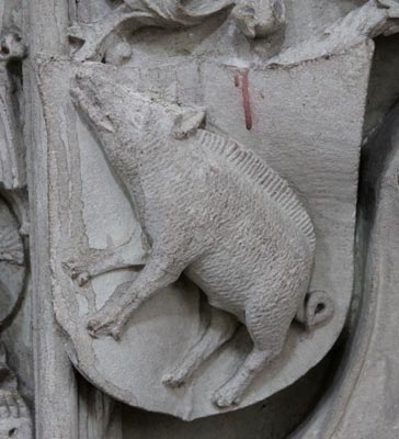 Vier Wappenschilde umgeben die Figur im inneren Rechteckfeld, wovon drei gut sichtbar sind, der vierte jedoch von den hier ansetzenden Stufen zum Chor größtenteils verdeckt wird. Heraldisch rechts oben sehen wir den Wappenschild der von Schlat (auch: Schlatt, Schlatter, Schlath) mit einem aufspringenden Eber (Siebmacher Band: WüA Seite: 231 Tafel: 129, Alberti S. 689). Die hier nicht dargestellte Helmzier wäre der Eber wachsend, wenn man eine Darstellung für Caspar von Schlat aus dem Jahr 1438 zugrundelegt. Die Tinkturen werden im Siebmacher nicht angegeben. An der Emporenbrüstung ist ein Schild für Anna Schlat als Stifterin aufgemalt, dort ist ein naturfarbener (brauner) Eber in silbernem Schild zu sehen, wobei die im Barock erstellten Darstellungen auf der Emporenbrüstung nicht per se verläßlich sind.