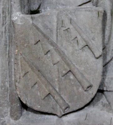 Vom vierten Schild links unten ist zu wenig zur Identifizierung zu erkennen, das wäre lt. DI das Wappen der von Thalheim (Talheim). Dieser Wappenschild ist durch den neuzeitlichen Einbau der Stufen zum Altarbereich so verdeckt, daß man diesen Schild nicht mehr sehen kann, höchstens sein Relief im Spalt ertasten kann. Dieses Wappen gehört zu Annas erstem Ehemann, denn sie war in erster Ehe mit Gerhard von Thalheim (Talheim) verheiratet, der wohl bald nach 1447 verstorben ist. Diese Familie nennt sich nach Talheim im Landkreis Heilbronn. Sie führt einen silbern-schwarz geteilten Schild, oben mit einem fünflätzigen rotenTurnierkragen (Siebmacher Band: WüA Seite: 68 Tafel: 43, Alberti). Auf einer historischen Aufnahme ist dieser Wappenschild noch zu einem größeren Ausmaß zu erkennen, und danach kann man dieses Wappenbild auch im sichtbar verbleibenden Rest verifizieren.