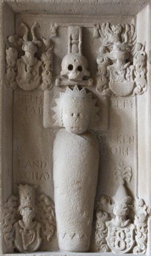 Dieses auf 1622 datierte Epitaph ist in der westlichen Vorhalle angebracht, ganz rechts innerhalb einer Vierergruppe am südlichen Teil der Westwand. Die Platte hat im unteren Drittel ein abgesetztes Inschriftenfeld. Die oberen zwei Drittel bilden eine vertiefte Zone mit einer an der linken, oberen und rechten Seite verlaufenden, zweiten Inschrift. Zwischen vier in den Ecken befindlichen Wappen, die alle namentlich zugeordnet sind, befindet sich die Darstellung eines Wickelkindes mit Zackenhaube, das von Vergänglichkeitssymbolen (Sanduhr auf Totenschädel, darunter balkenweise ein Knochen, ganz oben noch ein Waagbalken) überhöht wird.
