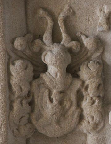 Abb. links: Wappen heraldisch unten rechts für die Großmutter väterlicherseits, Agnes Landschad von Steinach (gest. 1580), in Gold eine schwarze Harfe, die Helmzier ist ein gekröntes Männerhaupt mit wild wucherndem Haupt- und Barthaar, auch als Davidshaupt bezeichnet, das Haar die Helmdecke ersetzend. Das Wappen findet sich z. B. im Scheiblerschen Wappenbuch Folio 120, im Aschaffenburger Wappenbuch Tafel 76 Seite 61, im Ingeram-Codex und im Alten Siebmacher. Abb. rechts: Wappen heraldisch unten links für die Großmutter mütterlicherseits, Helena von Seckendorff (-19.10.1624), in Silber zwei rote, unten verbundene und achtförmig miteinander verschlungene Lindenzweige mit acht nach außen gerichteten Blättern; die Helmzier ist ein roter, hermelingestulpter Hut, oben mit schwarzen Hahnenfedern besteckt. Die Helmdecken sind rot-silbern. Das Wappen wird beschrieben im Siebmacher Band: Bay Seite: 22 Tafel: 15-16, Bad Seite: 76 Tafel: 45, Bay Seite: 57 Tafel: 60, Brau Seite: 9 Tafel: 7, He Seite: 26 Tafel: 28, Pr Seite: 27 Tafel: 30, Pr Seite: 64 Tafel: 82, Pr Seite: 374 Tafel: 422, Reu Seite: 9 Tafel: 7, Sa Seite: 16 Tafel: 15, Wü Seite: 4 Tafel: 4, Wü Seite: 11 Tafel: 14.