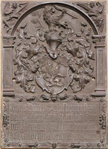 Dieses an der Wand angebrachte, bronzene Epitaph im Stile der Renaissance ist zweigeteilt. Der untere, niedrigere Teil enthält eine vierzeilige Inschrift, deren Platz außen mit Rollwerk verziert ist. Der obere Teil wird von einem auf zwei Wandvorlagen mit Basen und Kapitellen ruhenden Bogen eingerahmt; in den beiden sich ergebenden oberen Zwickeln sitzen Engel, der eine optisch oben links mit einem Schwert im Arm, der andere auf der rechten Seite mit einem Palmzweig. Innerhalb dieser Scheinarchitektur befindet sich das nach links gewendete Vollwappen von Heinrich Ortt (Orth).