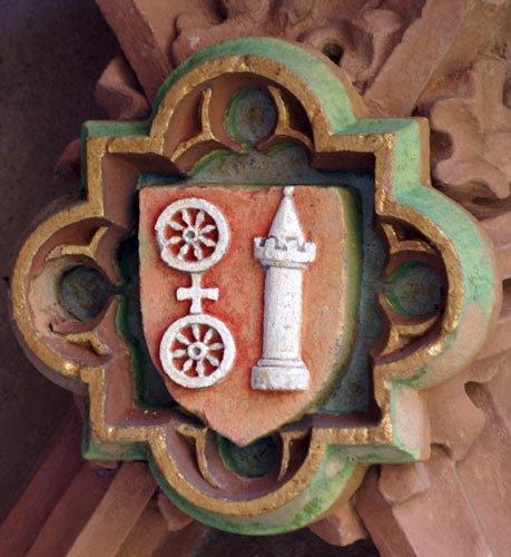 Ein ganz analoges Wappen in der alten Form wie hier aus dem Jahr 1440 finden wir auch am Laiengestühl in der Pfarrkirche (aus dem Jahr 1510), unter der Orgelbühne (ca. um 1500) und am Chorgewölbe der Kirche (von 1481). Ein weiteres, heute verschwundenes, aber in einer Zeichnung dokumentiertes Wappen befand sich einst außen neben dem Hauptportal der Pfarrkirche. Wenn man hingegen die Siegel von Kiedrich betrachtet, ergibt sich folgendes Bild: In Gerichtssiegeln von ca. 1420 und von 1581 und in einem Gemeindesiegel von 1641 steht der Turm jeweils heraldisch rechts, das kreuzverbundene Doppelrad links. Ebenso ist es an der Wappentafel am Rathaus von 1586 zu sehen. In einem Gerichtssiegel von 1695 und in Siegeln aus der Mitte des 17. Jh. und von 1735 steht das kreuzverbundene Doppelrad hingegen heraldisch rechts. Und ebenso ist es am Marktbrunnen von 1541 zusehen. Es scheint also, wenn man alle Darstellungen berücksichtigt, daß beide Varianten nebeneinander geführt wurden bzw. sich in ihrer Verwendung im Laufe der Geschichte abwechselten, wobei im kirchlichen Umfeld der Darstellung mit den Mainzer Rädern im höherrangigen ersten Feld der Vorzug gegeben wurde, wobei angemerkt sei, daß es sich nicht um das Hochstifts-Rad handelt, sondern um das städtische Doppelrad. Im Bereich des Rathauses bzw. des Gerichts ergibt sich eine Bevorzugung einer Darstellung mit dem Zinnenturm in der höherrangigen Position.