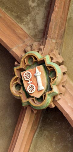Der westliche Gewölbewappenstein zeigt das Ortswappen von Kiedrich. In seiner heutigen Form, wie es am 29.10.1979 neu genehmigt wurde, ist das Ortswappen gespalten, rechts in Silber ein roter Zinnenturm, links in Rot ein silbernes, pfahlweise gestelltes, mit einem Kreuz verbundenes Doppelrad. Hier ist eine alte Form des Ortswappens zu sehen, in rotem Feld rechts ein silbernes, pfahlweise gestelltes, mit einem Kreuz verbundenes Doppelrad und links ein silberner Zinnenturm. Beide Objekte haben die gleiche Feldfarbe, und die optische Trennung durch die Spaltlinie und Verwendung inverser Farbschemata rechts und links dieser Trennlinie existiert noch nicht. Und die beiden gemeinen Figuren haben im neuen Ortswappen die Seiten gewechselt.
