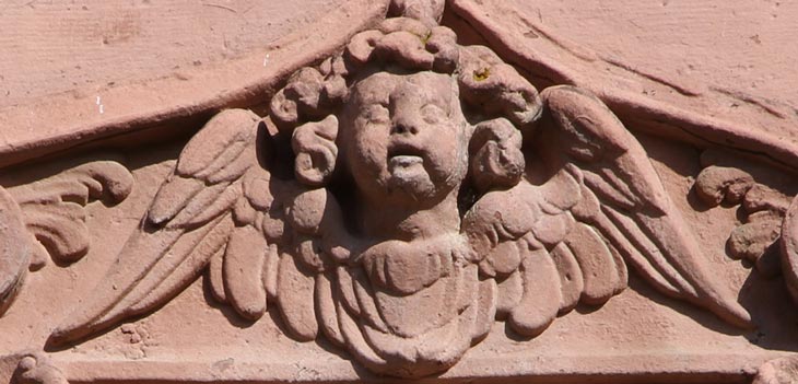 Heraldisch rechts unten befindet sich der Wappenschild für die Großmutter väterlicherseits, Margaretha von Hattstein (Abb. oben links). Das zerstörte Wappenbild heraldisch links unten (ohne vergrößerte Abb.) müßte dann für die Großmutter mütterlicherseits stehen, in unserem Fall für Agatha von Reiffenberg. Das Wappen der von Hattstein ist nach Siebmacher, Nassauer Adel, von Rot und Silber fünffach oder von Silber und Rot sechsfach schräg geteilt ist, hier ist es fünffach schrägrechts geteilt, die Variationsbreite ist bei diesem Wappen groß. Die hier nicht dargestellte Helmzier wäre ein wie der Schild bez. Flug zu rot-silbernen Decken. Nach Siebmacher, Nassauer Adel, laufen die Schrägteilungen des Fluges spiegelbildlich nach oben zur Mitte. Dieses rheinische Geschlecht gehört zum Hause Reiffenberg und spaltete sich als jüngerer Zweig ab. Das Geschlecht der von Hattstein blühte bis 1767, es starb mit Konstantin Philipp von Hattstein aus. Die von Reiffenberg führten das gleiche Wappen wie die von Hattstein in mehreren Linien, in der 1613 in den Freiherrenstand erhobenen und 1686 erloschenen Haupt-Linie aber abweichend den Schild mit einem dreilätzigen, blauen Turnierkragen belegt und als Helmzier zwei Eselsohren, rechts silbern, links rot, auch beide schwarz. Das Wappen wird beschrieben bei Zobel Tafel 132, im Siebmacher Band: NaA Seite: 24 Tafel: 36, Band: Lux Seite: 6 Tafel: 6, ferner bei Gruber S. 52-53.