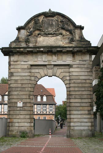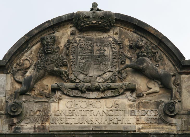 Bei dem Wappen im Giebelaufsatz des Tores handelt sich um das erste Wappen der englischen Könige aus dem Haus Hannover, welches in dieser Form von 1714 bis 1801 geführt wurde. Georg I. König von Großbritannien und Irland, Herzog v. Braunschweig u. Lüneburg, Kurfürst von Hannover (28.5.1660 - 22.6.1727) änderte bei seinem Regierungsantritt in Großbritannien 1714 das Staatswappen durch Ersatz des vierten Viertels, früher wie Feld 1 auch England/Schottland enthaltend, jetzt mit vier neuen Elementen: Braunschweig, Lüneburg, Hannover, Kaiserkrone (sog. Krone Karls des Großen). Insgesamt ist das Wappen also wie folgt aufgebaut: