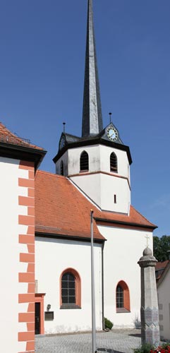 Die erste Pfarrkirche in Reichmannsdorf, das zu Schlüsselfeld eingemeindet wurde, stammte aus dem 15. Jh. und war eine Chorturmkirche. Auf diesen ersten Bau verweist die Steintafel mit Wappen, die über dem Türsturz in die Außenwand eingelassen ist. Sie wurde jedoch erst später angefertigt. Das Langhaus wurde ca. 1528 verbreitert. Nach den Zerstörungen im Dreißigjährigen Krieg wurde 1664 die Kirche neu gebaut. Markant ist der achteckige Kirchturm mit seiner nadelförmigen Spitze. 1921 wurde der Kirchenraum durch den Architekten Fritz Fuchsenberger (1876-1945) zur Seite hin erweitert.