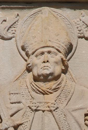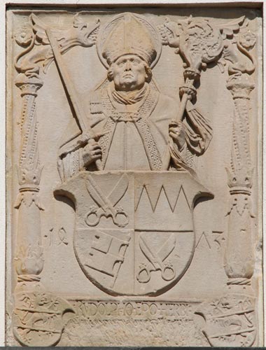 Die Steintafel über dem Eingang trägt das Datum 1473, in zwei Ziffernpaaren rechts und links des Wappenschildes. Der Stil des Reliefs entspricht aber nicht dieser Jahreszahl, vielmehr wird eine spätere Entstehung um ca. 1520 angenommen, und möglicherweise wurde das äußerst qualitätvolle Relief sogar vom Bildhauer Loy Hering angefertigt. Vermutlich wurde diese Bautafel im Zuge der Erweiterung der Kirche angefertigt und erinnert an den ursprünglichen Bauherrn der ersten Kirche. Zu dieser nachträglichen Anfertigung paßt auch der Nimbus hinter der Mitra, der nicht zu Lebzeiten verwendet worden wäre. Hinter dem Wappenschild wächst eine frontale Darstellung des Bischofs empor, in kirchlichem Ornat, mit Mitra auf dem Haupt, in der Rechten schrägrechts das Schwert, in der Linken schräglinks den Krummstab als Insignien seiner weltlichen und geistlichen Macht. Die Darstellung wird eingerahmt von zwei reichverzierten, im oberen Abschnitt gedrehten Säulen, auf deren oberen Abschlüssen zwei geflügelte Drachen hocken, die einwärts Feuer in Richtung auf den Nimbus hinter der Mitra speien.