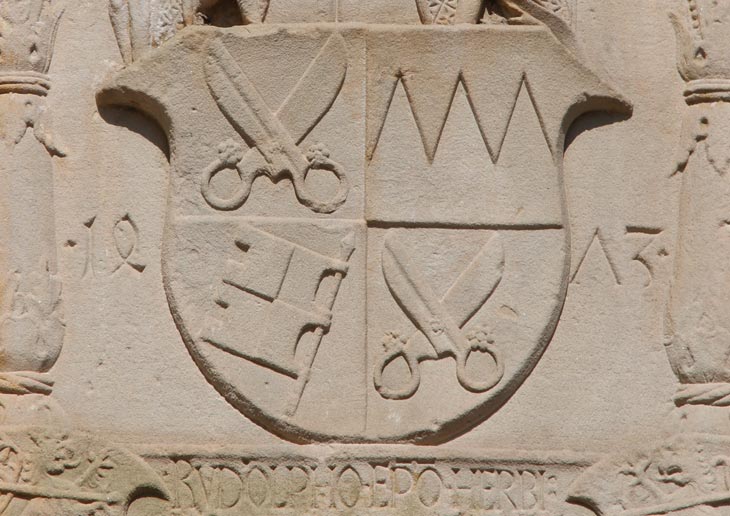 Der Wappenschild von Fürstbischof Rudolf II. von Scherenberg (amtierte 1466-1495) ist geviert, Feld 1 und 4: in Gold eine rote nach oben geöffnete Schere, Stammwappen der von Scherenberg, Feld 2: "Fränkischer Rechen" = von Rot und Silber mit drei aufsteigenden Spitzen geteilt, Herzogtum zu Franken, Feld 3: "Rennfähnlein" = in Blau eine rot-silbern gevierte schräglinksgestellte Standarte mit goldenem Schaft, Hochstift Würzburg. Gegenüber den üblichen Darstellungen, die immer den Fränkischen Rechen in Feld 1 zeigen, ist dieser Wappenschild komplett gespiegelt. Über die Gründe kann nur spekuliert werden. Ein Oberwappen wird nicht dargestellt. Unten erkennt man den Anfang einer Inschrift: "RVDOLPHO EP(ISCOP)O HERB(IPOLENSIS)......", dem Bischof Rudolf von Würzburg (oder auch: durch Rudolph Bischof von Würzburg)....., der untere Teil ist jedoch verwittert. Auch die Verwendung des ungewöhnlichen Falles, je nach Lesart Dativ oder Ablativ, weist auf eine nachträgliche Widmung der Tafel hin. Rudolf von Scherenberg erhob den Ort zur eigenständigen Pfarrei.
