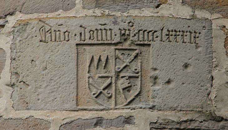 Das Wappen des Würzburger Fürstbischofs Julius Echter von Mespelbrunn (amtierte 1573-1617) ist geviert: Feld 1: "Fränkischer Rechen" = von Rot und Silber mit drei aufsteigenden Spitzen geteilt, für das Herzogtum zu Franken, Feld 2 und 3: in Blau ein silberner Schrägbalken, belegt mit drei blauen Ringen, Stammwappen der Echter von Mespelbrunn, Feld 4: "Rennfähnlein" = in Blau eine rot-silbern gevierte, an den beiden senkrechten Seiten je zweimal eingekerbte, schräggestellte Standarte mit goldenem Schaft, für das Hochstift Würzburg. Die Detailaufnahmen zeigen die hohe künstlerische Qualität dieses Steines, der sich diesbezüglich mit dem am Amtshaus messen kann. Die ovale Kartusche wird von einer reichverzierten Bischofsmütze überhöht, hinter ihr sind schräggekreuzt das gestürzte Schwert und der Krummstab zu sehen. Nicht nur die Kanten der Inful, sondern auch die beiden abflatternden Bänder sind mit Edelsteinen geschmückt. Zu Füßen des Wappens sind zwei geflügelte Putten zu sehen, der eine umklammert hingekauert eine Säule mit ionischem Kapitell, der andere reckt kampfeslustig ein Schwert empor, Stärke und Wehrhaftigkeit symbolisierend.
