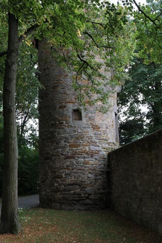 Abb. links: Der Weiße Turm ist ein im 14.-16. Jh. entstandener Rundturm der inneren Stadtbefestigung in der Weiße-Turm-Straße. Von dieser inneren Stadtmauer haben sich bis auf diesen Turm im Osten und dem Eulenturm im Westen nur wenige Spuren von Mauern und Türmen erhalten, weil das meiste davon in Häusern verbaut ist. Gut erhalten ist jedoch der einstige Graben. Abb. rechts: Rundturm der äußeren Stadtbefestigung aus der 2. Hälfte des 15. Jh. im Ostbereich der Altstadt.