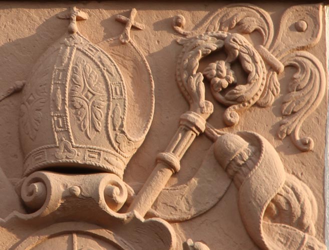 Die Detailaufnahmen zeigen die hohe künstlerische Qualität dieses Steines, der sich diesbezüglich mit dem aus dem gleichen Jahr stammenden Wappenstein in der Marktstraße 16 messen kann. Die ovale Kartusche wird von einer reichverzierten Bischofsmütze mit jeweils einem Kreuz an der Spitze jedes Mützenzipfels und mit zwei aus der Mütze unten heraushängenden und zu beiden Seiten wehenden Bändern überhöht, hinter ihr sind schräggekreuzt das gestürzte Schwert und der Krummstab zu sehen. In den beiden oberen Ecken befinden sich schräg nach außen gestellte, stilisierte Lilien als Ornament.