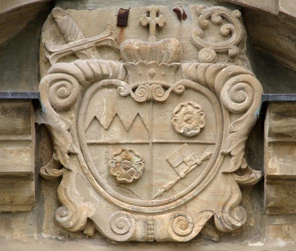 Das komplexe Wappen des Würzburger Fürstbischofs Johann Philipp Franz von Schönborn (reg. 1719-1724) besitzt einen Hauptschild mit zehn Inhalten und einen Herzschild: Feld 1: in Gold ein schwarzer Doppeladler, oben begleitet von einer goldenen Krone, kaiserlicher Doppeladler, Feld 2: "Fränkischer Rechen" = von Rot und Silber mit drei aufsteigenden Spitzen geteilt, für das Herzogtum zu Franken, Feld 3: Erzherzogtum Österreich auf einem kleinen Schild: in Rot ein silberner Balken, ein besonderes Gnadenzeichen, Feld 4: in Rot drei (2:1) silberne Schildchen, reichsständische Herrschaft Reichelsberg, Feld 6: in Blau ein silberner Balken, begleitet von 3 (2:1) silbernen Rauten, Herrschaft Heppenheim, Feld 7: in Schwarz 3 (2:1) goldene aufrechte Getreidegarben, von Buchheim, Feld 9: in Hermelin auf einem roten und mit goldenen Troddeln verzierten Kissen ein goldener Reichsapfel mit goldenem Kreuz, Erbtruchsessen-Amt in den österreichischen Landen ob und unter der Enns, Feld 10: in Gold ein schwarzer Wolf, Grafen von Wolfsthal, Feld 11: "Rennfähnlein" = in Blau eine rot-silbern gevierte, schräggestellte und an den beiden senkrechten Seiten je zweimal eingekerbte Standarte mit goldenem Schaft, für das Hochstift Würzburg, Feld 12: in Silber ein blauer Löwe, belegt mit zwei roten Balken, Wappen der Truchsess von Pommersfelden, Herzschild: in Rot auf drei silbernen Spitzen ein schreitender, goldener, gekrönter Löwe, Stammwappen der Grafen von Schönborn.