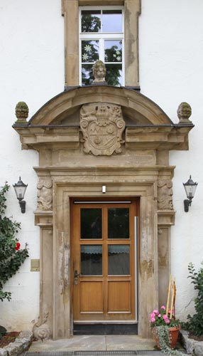 Interessanterweise sind in der Komposition weder ein Schwert noch ein Krummstab zu sehen, diese sind dafür unten auf dem Scheitelstein des Portals hinter einer Mitra schräggekreuzt. Außen begleiten zwei Putten als Schildhalter die beiden fürstbischöflichen Wappen. Der breitgespannte Wappenmantel schließt auch diese beiden Putten mit ein. Das Portal selbst trägt die Jahreszahl 1719, das Jahr des Wechsels auf dem Würzburger Bischofsthron.