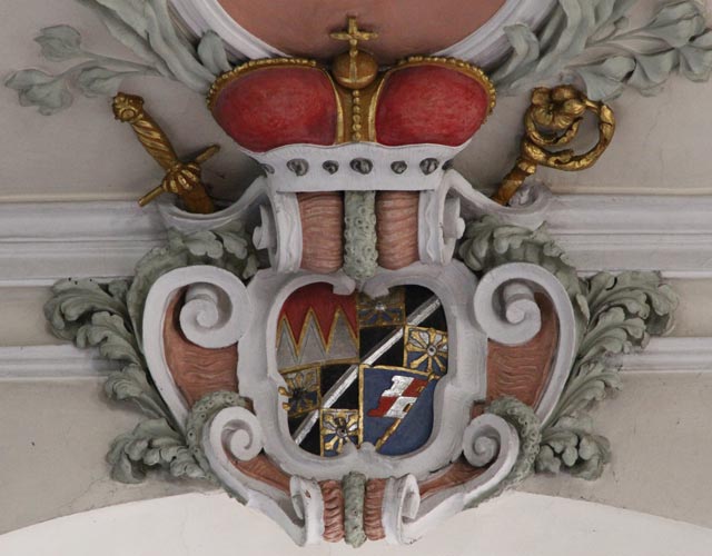 Genau das gleiche Wappen für diesen Fürstbischof sehen wir im Inneren der ehem. Klosterkirche aus bemaltem und vergoldetem Holz gefertigt über dem Hauptaltar. Konnte sein Amtsvorgänger noch die Stuckierung der Kirche erleben, so erfolgte die Ausstattung innen doch unter seinem Nachfolger Johann Philipp Franz von Schönborn. Bei diesem Exemplar ist die Einteilung der Schildfläche im Detail eine andere, die Trennlinien in der mittleren Spalte stimmen nicht mit denen der beiden äußeren Spalten überein, und der Herzschild wirkt hochgesetzt und ragt mit der ihn überspannenden Krone weit in das Feld mit dem Fränkischen Rechen hinein. Im Bild unten links sehen wir die beiden gleichen Fürstbischöfe, die auch am Portal als Beginner und als Vollender vereint sind, mit ihren Wappen genau übereinander stehen.