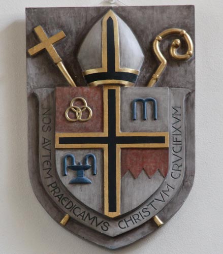 Für das letzte und zeitlich modernste Wappen kehren wir wieder zum Ausgangspunkt unserer Betrachtung zurück: Gleich unterhalb der Bautafel von Julius Echter im linken Querschiff hängt das Wappen von Julius Döpfner (26.8.1913-24.7.1976, amtierte als Würzburger Bischof 1948-1957). Das Wappen wird geviert durch ein ringsum golden bordiertes, schwarzes Balkenkreuz, Feld 1: in Rot drei (1:2) miteinander verschränkte goldene Ringe, Feld 2: in Silber die blaue Minuskel "m", Feld 3: in Silber ein blauer Springbrunnen mit zwei bogenförmigen Fontänen außen, Feld 4: rot-silbern mit drei aufsteigenden Spitzen geteilt. Die Devise läuft an den unteren Seiten um den Schild herum: "NOS AVTEM PRAEDICAMVS CHRISTVM CRVCIFIXVM". Vollständig lautet Korinther, Kapitel 1, Vers 23: Nos autem praedicamus Christum crucifixum Iudaeis quidem scandalum gentibus autem stultitiam - wir aber predigen den gekreuzigten Christus, für die Juden ein Skandal und für die Griechen eine Dummheit. Auf dem Schild ruht eine mit goldenbordierten, schwarzen Streifen verzierte Mitra, schräglinks hinter dem Schild steht ein goldenes Vortragekreuz, schrägrechts ein ebensolcher Krummstab.