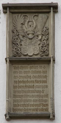 Die Inschrift im unteren Bereich des Steines lautet: "Nach christi geburt m d xxv (1525) ja(h)r umb chiliani hat der E(h)rw(ü)rdig(e) durchleuchtig(e) hochgebor(e)n(e) Fürst und her(r) herr Fri(e)drich marggrave zw Brandennburg Et Thumprobst zu Würtzb(u)rg dies(en) paw vo(n) neuem aus dem grundt an(ge)fah(ng)e(n) und umb Bartholomei des xx viii Ja(h)r vollende(t)." Dies erklärt, warum hier ein markgräfliches Wappen mitten in würzburgischem Hoheitsgebiet auftaucht - der Bauherr war ein Würzburger Dompropst aus dieser Familie: Friedrich Markgraf von Brandenburg-Ansbach (17.1.1497-20.8.1536) war der Sohn von Friedrich Markgraf v. Brandenburg-Ansbach (8.5.1460-4.4.1536) und Sofia Jagiellonica Prinzessin von Polen (6.5.1464-5.10.1512). Der Bauherr war damit ein Enkel des Königs Kasimir IV. von Polen. Er stand als katholischer Geistlicher und Gegner der Reformation eher in Opposition zum Ansbacher Hof und stellte sich gegen die Politik seines dort herrschenden Bruders Georg Markgraf v. Brandenburg-Ansbach (4.3.1484-27.12.1543), der übrigens auch einmal Domherr in Würzburg war, nämlich 1498-1506, aber schon früh ein Anhänger Luthers wurde und die Reformation in seinen Gebieten einführte. Friedrich wurde am 10.2.1511 Domherr in Würzburg, und er war dazu auch Domherr in Mainz und Chorherr in Salzburg. Im Jahre 1513 wurde er Dompropst in Würzburg, 1516 Propst zu St. Gumbertus in Ansbach. Dazu war er auch noch Propst des Stifts Haug in Würzburg. Im Bauernkrieg 1525 war er Kommandant der Festung Marienberg in Würzburg und hielt die Festung, bis der geflohene Fürstbischof Konrad II. von Thüngen zurückkehren konnte. Auch in Ochsenfurt gab es 1525 Aufstände. Am 21.8.1536 wurde er im Kloster S. Domenico in Genua begraben, er kam dorthin im Gefolge des Heerzuges von Kaiser Karl V., und er wurde ein Opfer der Pest. Im Würzburger Dom befindet sich ein Epitaph aus weißem Marmor für ihn mit den Schilden für Brandenburg, Sachsen, Bayern und Österreich auf der Schwertseite, sowie für Polen, Österreich, Meißen und Böhmen auf der Spindelseite.
