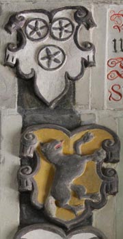 Ohne gesicherte personelle Zuordnung sind wir auf der optisch rechten, heraldisch linken Seite der Ahnenprobe. Der erste Schild zeigt in der heutigen Farbfassung in Blau einen silbernen, mit drei roten Rosen belegten Schrägbalken. Bei genauem Hinsehen erkennt man aber, daß der Schrägbalken nur aufgemalt ist und ohne Entsprechung im Relief des Schildes. Vielmehr ist dort eine durchgehende Damaszierung zu sehen, was die heutige Farbfassung grundsätzlich in Frage stellt: Hier war vom Steinmetz kein Schrägbalken vorgesehen. Nach Biedermann ist die Mutter des Wolff von Steinau gen. Steinrück nämlich Margarethe von Miltz, Tochter von Georg von Miltz. Dieses paßt, denn die von Miltz führten in Rot drei silberne, golden bebutzte Rosen schrägbalkenweise. Die Helmzier wäre auf dem Helm mit rot-silbernen Decken ein hoher roter Hut, oben mit drei Straußenfedern besteckt, einer roten zwischen zwei silbernen, der Schaft beiderseits mit einer halben silbernen Rose besteckt (lt. Aschaffenburger Wappenbuch).