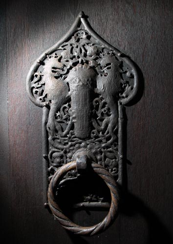 St. Nikolaus in Hall in Tirol ist eine Pfarrkirche am Oberen Stadtplatz in der Altstadt. Mit zunehmender Bedeutung der Stadt Hall wurde die aus dem 13. Jh. stammende Kirche mehrfach umgebaut, erst 1352 erweitert, dann 1420-1440 zu einer dreischiffigen Kirche umgebaut, wobei der alte, 1312-1318 errichtete Chor behalten und lediglich erhöht wurde, so daß er heute achsenversetzt steht. Bedeutende Ein- und Anbauten sind die Waldauf-Kapelle im Norden (geweiht 1501) und die Fieger-Kapelle im Westen (fertiggestellt 1490). Beide Familien haben reiche heraldische Spuren in der Kirche hinterlassen, und sowohl die Vorhalle unter der Fieger-Kapelle als auch die Arkaden des ehem. Friedhofs enthalten viele heraldisch interessante Grabtafeln. Bei all der Pracht dieser Tafeln übersieht man leicht die mit heraldischen Motiven verzierten Schloßblätter der Kirchentüren, prachtvolle Meisterwerke der Schmiedekunst aus dem frühen 16. Jh., hier sowohl in natürlichem Tageslicht als auch nächtens mit Seitenblitz photographiert.