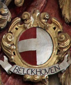 Der letzte Schild dieser Seite ist der der Familie von Belckhoven (von Pelckhofen), rot-silbern gespalten, rechts ein silberner Balken, hier letzterer mit der linken Hälfte verschmolzen, in der Literatur mal mit, mal ohne Trennlinie dargestellt. Im alten Siebmacher von 1605 ist das Motiv ohne Trennlinie, aber seitenverkehrt im Vergleich zum hiesigen Befund, das Kleinod zu rot-silbernen Decken besteht aus einem Paar Büffelhörner in den Formen und Farben des Schildes. Identisch wird das Wappen abgebildet im Wappenbuch des churbayrischen Adels (BSB Cgm 1508), Bild 68. An einem Epitaph für Franz Joseph Wilhelm von Pellkoven von Wildthurn (1722-1778) in St. Martin in Landshut wird der Schild hingegen mit Trennlinie dargestellt, auf dem gekrönten Helm mit rot-silbernen Decken ein rot-silbern geteiltes Paar Büffelhörner. Weitere Nachweise im Siebmacher Band: Bay Seite: 50 Tafel: 50, Band: Erg Seite: 17, dort rot-silbern gespalten mit einem silbernen Balken vorne. Der Schild steht hier für die Urgroßmutter Eva Dorothea von Pelckhofen, Ehefrau von Johann Sebastian von Brand. Die von Pelkhofen, Pellkhouen, Pelkoffer oder auch Pellkofer zu Weng und Hochenbuchbach erhielten 1688 den bayerischen Freiherrenstand.