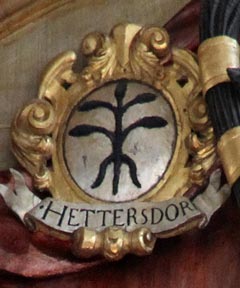 Das Wappen der von Hettersdorf, das in der Mitte der Komposition als Vollwappen auftaucht, begegnet uns erneut optisch ganz links oben als Eröffnung der Ahnenprobe. Der Schild zeigt in Silber einen ausgerissenen schwarzen Eichenschößling, auf dem gekrönten Helm mit schwarz-silbernen Decken ein schwarzer Eichenschößling zwischen zwei einwärts gebogenen Bärentatzen mit je zwei silbernen oder wie hier goldenen Spangen. Der Schild der Ahnenprobe steht für den Vater des Probanden, Georg Adolph von Hettersdorf (-1711), den Großvater väterlicherseits, Johann Schweickhard von Hettersdorf, sowie für dessen Vater, Adolph Philipp von Hettersdorf. Das Wappen wird beschrieben im Aschaffenburger Wappenbuch Tafel 64, Seite 31, 74, 103, 122-124, 224, im Rahrbach S. 123-124, im Alberti S. 287 sowie im Siebmacher Supplement IV -14.