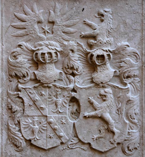 Das große Ehewappen über der Inschrift zeigt heraldisch rechts das Wappen des Ehemannes, das der Familie Luz zu Glätsch, es ist geviert, Feld 1 und 4: in Blau ein silberner, mit drei roten Kugeln (Ballen) belegter Schrägbalken zwischen zwei goldenen Sternen, Feld 2 und 3: in Gold ein golden gekrönter, schwarzer Adler. Auf dem bewulsteten Helm mit rechts rot-silbernen, links schwarz-goldenen Decken ein goldener Stern zwischen einem rechts rot-silbern, links golden-schwarz geteilten Flug. Das Wappen wird beschrieben im Siebmacher Band: Tir Seite: 23 Tafel: 26. Hanns Luz hatte von Kaiser Karl V. am 14.8.1544 aufgrund geleisteter Kriegsdienste zusammen mit seinen Brüdern Michael, Caspar und Ambrosi den Adelsstand erhalten. Der genannte Michael Luz kaufte den Sitz Glätsch in der Herrschaft Villanders im Eisacktal oberhalb von Klausen, Hans hingegen erwarb 1598 den Sitz Camp bei Klausen.