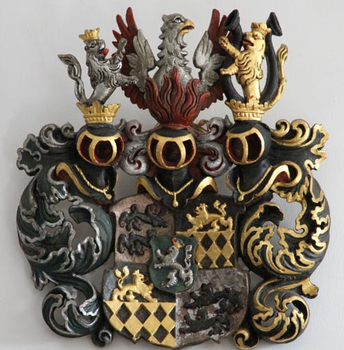 Ein weiteres plastisches Wappen befindet sich über der nach Osten aus dem Raum in den Durchgang führenden Tür. Es entspricht in der Ausführung dem in ähnlicher Weise im Rittersaal über dem Nebenzugang angebrachten Wappen. Der Schild enthält die eingangs erläuterten Elemente.