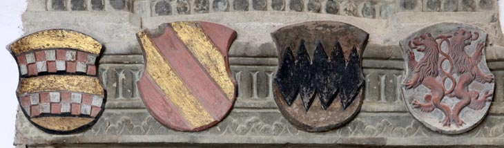 Heraldisch ganz rechts steht der Schild für den Vater, Albrecht Truchseß von Wetzhausen zu Bundorf (1448-1499), hochfürstlich würzburgischer Rat und Amtmann zu Rothenstein, Stifter der Bundorfer Linie, aus der später wieder die Hauptlinie zu Wetzhausen wurde, und für den Großvater väterlicherseits, Dietz (Dietrich) Truchseß von Wetzhausen (-1481) aus der später erloschenen älteren Linie zu Wetzhausen, zu Rothenstein, Friesenhausen und Bundorf, Ritter und kaiserlicher Amtmann zu Schweinfurt, hochfürstlich würzburgischer Rat, Hofmeister, Hauptmann auf der Festung Marienberg und Amtmann zu Wildberg. Der Schild zeigt in Gold zwei zu je zwei Reihen rot-silbern geschachte Balken. Als zweites sehen wir das Wappen für die Mutter des Probanden, Margaretha von Hutten (1456-), und den Großvater mütterlicherseits, Conrad von Hutten zu Frankenberg, hochfürstlich würzburgischer Rat, Oberhofmeister und Amtmann zu Trimberg. Der Schild zeigt in Rot zwei goldene Schrägbalken. Der dritte Schild steht für die Großmutter väterlicherseits, Dietrichs erste, 1445 geehelichte Frau, Dorothea Voit von Salzburg (-1461), die Tochter von Hans Voit von Salzburg und Dorothea von Hutten zu Steckelberg. Dietrich (Dietz) Truchseß von Wetzhausen hatte danach noch zweimal geheiratet, aber beide Ehen blieben kinderlos, zuerst 1462 Margaretha von Redwitz (-1464) und 1465 Ursula von Giech zu Buchau (-1474). Der Schild der Voit von Salzburg zeigt in Silber einen schwarzen Zickzackbalken mit 5 Spitzen. Der vierte und letzte Schild heraldisch ganz links steht für die Großmutter mütterlicherseits, Anna von Rechberg, Witwe des Ritters Conrad von Züllnhard, Pfleger zu Stadtlauringen. Ihr Wappen zeigt in Silber zwei voneinander abgewendete rote Löwen mit verschlungenen Schwänzen.