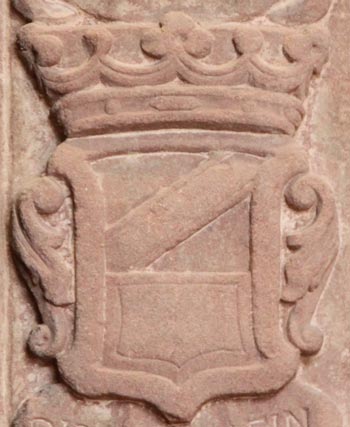 Das zentrale Vollwappen ist das der von Hutten zu Stolzenberg, in Rot zwei goldene Schrägbalken, auf dem Helm mit rot-goldenen Decken ein wachsender bärtiger Männerrumpf, rot gekleidet mit goldenen Aufschlägen, auf dem Kopf eine mit drei schwarzen Hahnenfederbüschen an der Spitze und im Stulp geschmückte rote Spitzmütze mit goldenem Aufschlag (Wolfert Tafel 13 Seite 49, 68, 141, Siebmacher Band: He Seite: 14 Tafel: 15 und Band: Bay Seite: 41 Tafel: 39, Zobel Tafel 160 et al.). Bei dieser Darstellung sind Schild, Helm und Helmdecken zeittypisch durchschnittlich und schlecht proportioniert, besonders lobend soll hier jedoch die äußerst plastisch und detailreich gearbeitete Helmzier hervorgehoben werden, auch wenn sie nicht der Helmausrichtung folgt, eine Figur, bei der das Gesicht aufwendig durchmodelliert ist und selbst Details wie Mantelknöpfe und Knopflöcher mit Hingabe ausgeführt sind, was in Kontrast zu den eher schlecht fallenden Decken steht. Das schneckenförmig eingerollte Gewand unterhalb der Schulter verwirrt ein wenig, weil das Kleinod traditionell ein Rumpf ist und hier durchgehender Stoff erwartet wird. Das entspringt künstlerischer Freiheit und ist inhaltlich nicht signifikant.